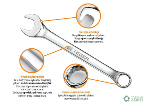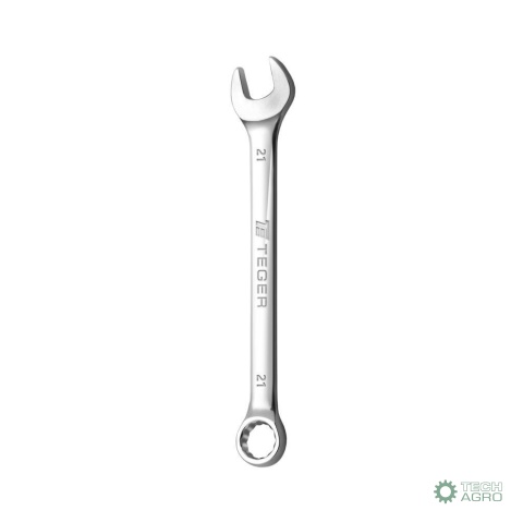 Klucz płasko-oczkowy 21 mm / TEGER wykonany ze stopu stali chromowo-wanadowej CRV, wytrzymałej na naprężenie statyczne i kinetyczne. Unikalna powłoka na powierzchni znacząco zwiększa komfort pracy oraz pozwala na utrzymanie narzędzi w czystości. Klucz kuty matrycowo, odpory na odkształcenia doskonale wykalibrowany. Dwunastokątna końcówka klucza oczkowego, dodatkowo odgięta ułatwia manewrowanie kluczem. Przeznaczony do prac nawet w najcięższych warunkach pod dużym obciążeniem