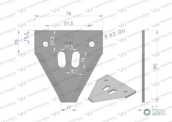 Nóż żniwny 80x76x2.7mm otwór 6.5 zastosowanie 1096606 420100046 Schumacher WARYŃSKI ( sprzedawane po 25 )