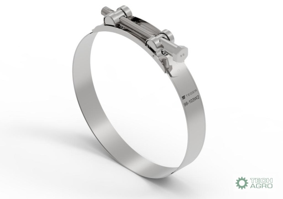 Opaska zaciskowa GBS 98-103 skręcana wzmacniana (obejma W2 - stal nierdzewna) szerkość 24mm TEGER. Skręcane śrubą z łbem sześciokątnym oraz dwoma sworzniami wewnętrznymi pełnymi. Dzięki czemu charakteryzują się zwiększoną siłą zacisku. Opaski zaciskowe GBS - łatwe w montażu: kluczyk, trwałe, duża siła zaciskająca.