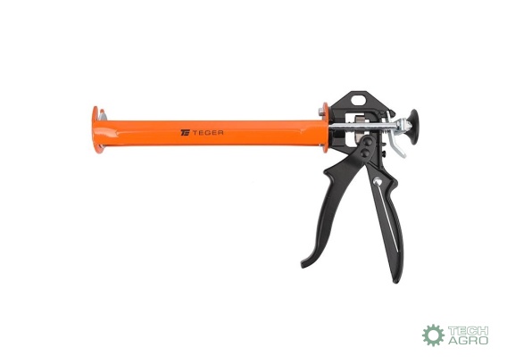 Wyciskacz do mas silikonowych 245 mm - bez blokady wypływu masy - wzmocniony / TEGER profesjonalny wyciskacz, przeznaczony do aplikacji gęstych kleistych mas plastycznych takich jak kleje czy kotwy. Wzmocniona konstrukcja oraz podwójne prowadzenie tłoka, zwiększają siłę nacisku i skuteczność aplikacji. Zapewnia łatwe i skuteczne aplikowanie mas z tub o długości do 245 mm. Wytrzymały, mocny i trwały lakierowany korpus wykonany z blachy stalowej, wygodny, profilowany, ergonomiczny uchwyt wykonany z aluminium oraz precyzyjny mechanizm zapadkowy zadba o jakość i ergonomię pracy zarówno profesjonalistów jak i domowych majsterkowiczów.