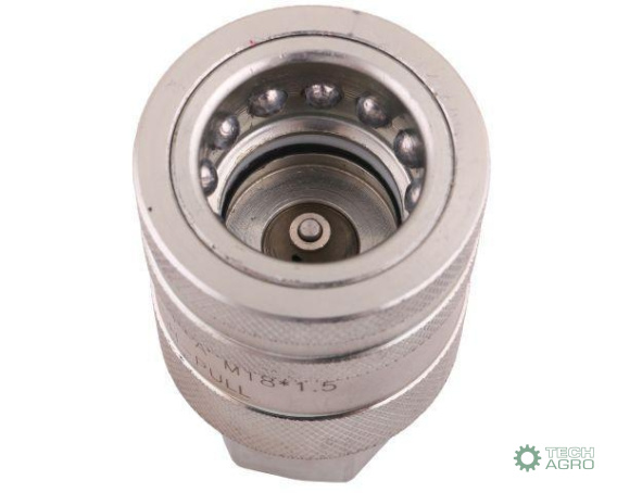 Szybkozłącze hydrauliczne gniazdo z eliminatorem ciśnienia M18x1.5 gwint wewnętrzny EURO PUSH-PULL (ISO 7241-A) Waryński. Eliminator ciśnienia umożliwia połączenie hydrauliki bez potrzeby stosowania nadmiernej siły, co zapewnia szybki i łatwy proces połączenia w każdej sytuacji (statyczne ciśnienie pomiędzy dwoma systemami hydraulicznymi jest rozprężane). Jest to idealne rozwiązanie łączenia hydrauliki o bardzo szerokim spektrum zastosowań. Ten rodzaj wykonania gniazda szybkozłącza zabezpiecza również przed pęknięciem/zerwaniem przewodu hydraulicznego i utratą oleju hydraulicznego w przypadku jego niezamierzonego naciągnięcia - np. odjazd ciągnika bez odczepienia hydrauliki z podłączonej maszyny (montaż gniazda szybkozłącza do korpusu/obudowy w ciągniku za tuleję blokującą). Szybkozłącza zaprojektowane są zgodnie z wymogami wymiarowymi i jakościowymi normy ISO 7241 Seria A, która określa szczegółowo charakterystykę i wymiary, aby umożliwić kompatybilność szybkozłączy produkowanych przez różnych producentów zgodnie z tym standardem. Zamienne z szybkozłączami ISO-A innych producentów takich jak: Parker, Faster, Stucchi, DNP, Tema i innych.