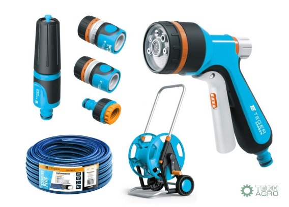 Zestaw ogrodowy 1/2" (wąż 20m, zestaw natryskowy, pistolet, wózek na wąż) / TEGER / Wysokiej jakości 4 elementowy zestaw do podlewania wykonany z wysokiej jakości materiałów charakteryzuje się żywotnością, odpornością, ergonomią kształtu i najwyższą jakością wykonania. Zestaw zawiera: Zestaw natryskowy 1/2" & 3/4" / Pistolet natryskowy - 7 funkcji. przedni spust / Wózek na wąż - teleskopowy / Wąż ogrodowy "STANDARD PLUS" FI 1/2". 20m