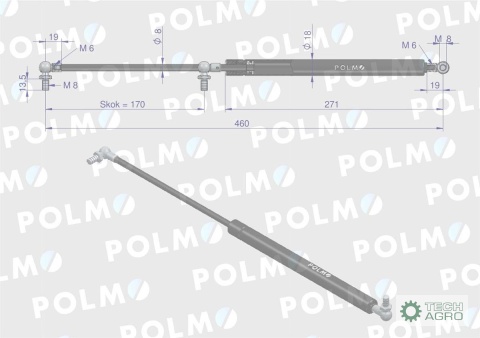 Siłownik szyby przedniej szyby tylnej 5089567P L max. 460mm CASE IH NEW HOLLAND CASE IH FIAT MASSEY FERGUSON NEW HOLLAND POLMO